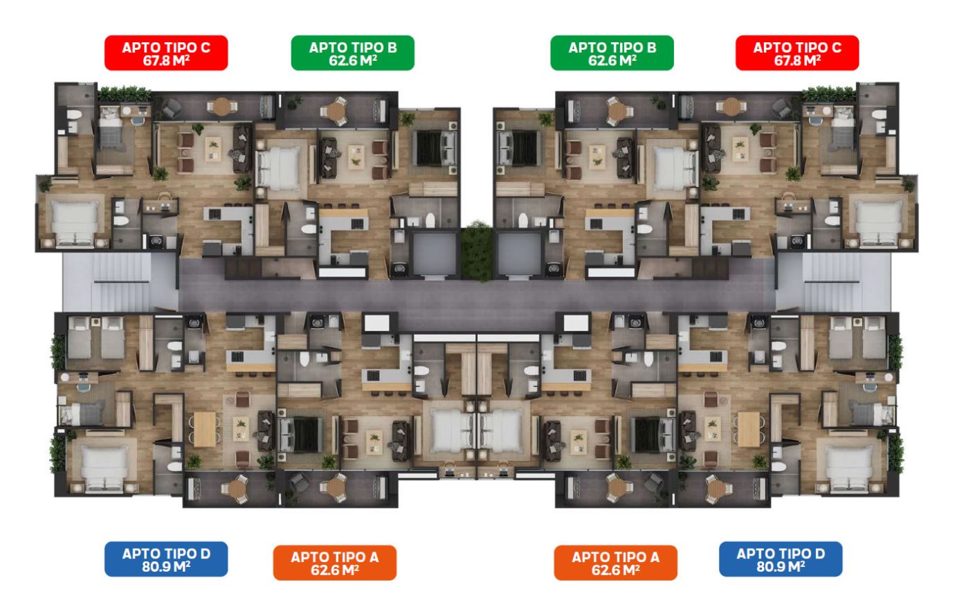 Una torre de 5 niveles con parqueaderos privados, locales comerciales, modernos loft para estadías cortas y dos torres de apartamentos.