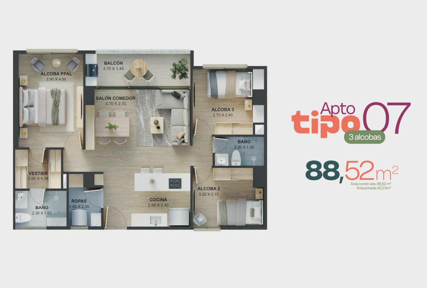 El proyecto cuenta con una torre de 9 pisos y apartamentos desde 61 m² hasta 88 m², disponibles en opciones de 1, 2 y 3 alcobas. Todas las unidades se entregan completamente terminadas e incluyen parqueadero y cuarto útil.