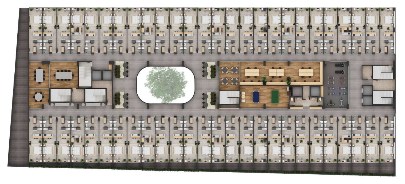 Lavandería, Baños sociales, Gimnasio, Zona lounge, Terraza social, Sala de reuniones, Zona de juegos, Bicicletero, Zona gaming, Lunch spot, Co-working.